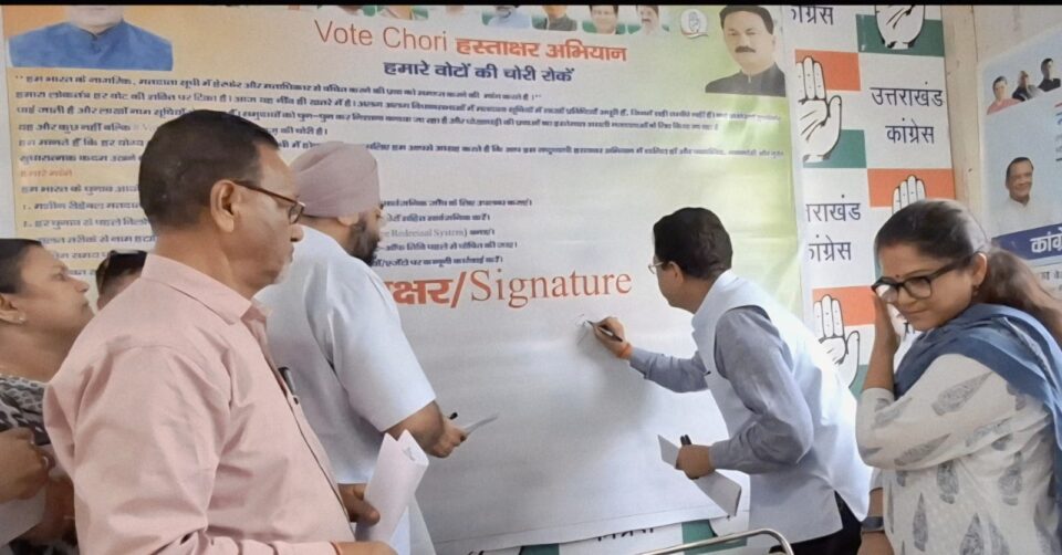 देहरादून। वोट चोरी के खिलाफ कांग्रेस द्वारा चलाए जा रहे आंदोलन के दूसरे चरण में आज राष्ट्रव्यापी हस्ताक्षर अभियान के तहत उत्तराखंड में भी कांग्रेस का हस्ताक्षर अभियान शुरू हो गया। प्रदेश कांग्रेस मुख्यालय में प्रदेश कांग्रेस कमेटी के वरिष्ठ उपाध्यक्ष संगठन सूर्यकांत धस्माना ने विधिवत रूप से पार्टी मुख्यालय में पत्रकारों वार्ता के बाद पार्टी पदाधिकारियों व कार्यकर्ताओं के साथ हस्ताक्षर अभियान का श्री गणेश किया। पार्टी सभागार में लगे वोट चोरी के खिलाफ हस्ताक्षर अभियान के बैनर पर हस्ताक्षर कर श्री धस्माना ने अभियान के लिए छपे फार्म पर हस्ताक्षर किए व उनके बाद पार्टी के वरिष्ठ पदाधिकारियों व कार्यकर्ताओं ने हस्ताक्षर किए। इस अवसर पर श्री धस्माना ने मीडियाकर्मियों को संबोधित करते हुए कहा कि विगत सात अगस्त को कर्नाटक की एक लोकसभा सीट की एक ही विधानसभा में कैसे चुनाव आयोग की मिलीभगत से एक लाख से ज्यादा फर्जी वोट की बदौलत भाजपा ने सेंट्रल बेंगलुरु की हारी हुई सीट जीत ली। श्री धस्माना ने कहा कि राहुल गांधी के इस खुलासे के बाद पूरे देश की जनता इस सच्चाई को जन गई है कि भाजपा चुनाव आयोग की मिलीभगत से पिछले अनेक वर्षों से वोट चोरी करके केंद्र व राज्य में सरकारें बना रही है इसलिए देश भर में वोट चोरी के मुद्दे पर लोग आंदोलित हो रहे हैं। श्री धस्माना ने कहा कि उत्तराखंड समेत देश के हर प्रांत में कांग्रेस पार्टी द्वारा आयोजित वोट चोर गद्दी छोड़ रैलियां में जन सैलाब सड़कों पर उतरा और अब एक महीने के हस्ताक्षर अभियान में देश भर में पांच करोड़ नागरिकों से वोट चोरी के खिलाफ हस्ताक्षर करवा कर भारत के चुनाव आयोग को सौंपा जायेगा। श्री धस्माना ने कहा कि उत्तराखंड की सभी 70 विधानसभाओं से पांच लाख नागरिकों से हस्ताक्षर करवा कर राष्ट्रीय अध्यक्ष श्री मल्लिकार्जुन खड़गे व लोक सभा में विपक्ष के नेता श्री राहुल गांधी जी को सौंपा जायेगा। श्री धस्माना के साथ महानगर अध्यक्ष डॉक्टर जसविंदर सिंह गोगी, प्रदेश महासचिव जगदीश धीमान,प्रदेश श्रम प्रकोष्ठ अध्यक्ष दिनेश कौशल, प्रदेश सोशल मीडिया अध्यक्ष विकास नेगी, कार्यकारी अध्यक्ष विशाल मौर्य, मनीष नागपाल, राजेंद्र शाह, डॉक्टर प्रतिमा सिंह, किशोर उनियाल, श्रीमती मंजू त्रिपाठी, ललित भद्री,सावित्री थापा, विप्लवी कवि दयाल, सुशीला देसाई, शीला श्रीवास्तव,इंदु सिंह, रंजना देवी,मंजू चौहान,गुड्डी मनराल,सुनीता धारिया,कुसुम पंवार समेत बड़ी संख्या में कांग्रेस कार्यकर्ताओं ने हस्ताक्षर अभियान में भाग लिया।