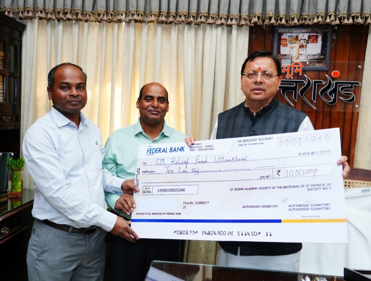 देहरादून, 25 अक्टूबर। मुख्यमंत्री पुष्कर सिंह धामी से आज मुख्यमंत्री कैंप कार्यालय में सेंट जोसेफ अकादमी, देहरादून के स्कूल प्रबंधन ने मुलाकात कर आपदा पुनर्निर्माण कार्यों हेतु मुख्यमंत्री राहत कोष में ₹10 लाख की धनराशि प्रदान की। मुख्यमंत्री ने सेंट जोसेफ अकादमी का आभार व्यक्त करते हुए कहा कि यह योगदान आपदा प्रभावितों की सहायता एवं पुनर्निर्माण कार्यों के लिए उपयोगी सिद्ध होगा। उन्होंने कहा कि राज्य सरकार प्रत्येक आपदा प्रभावित व्यक्ति के साथ खड़ी है। इस अवसर पर ब्रदर जोसेफ एम. जोसेफ, ब्रदर एस्टिनस कुजूर, एसके.नैथानी, सचिन अग्रवाल, भवनेश नेगी मौजूद रहे।