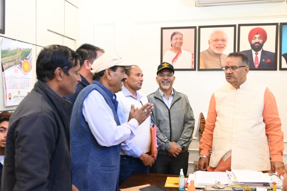 देहरादून, 12 नवम्बर। ग्राम्य विकास मंत्री गणेश जोशी से आज जनपद चमोली के कर्णप्रयाग क्षेत्र के खत्याड़ी गांव से आए एक प्रतिनिधिमंडल ने मुलाकात की। प्रतिनिधिमंडल का नेतृत्व क्षेत्र पंचायत सदस्य सेवानिवृत्त सूबेदार लेफ्टीनेंट नन्द किशोर थपलियाल ने किया। इस दौरान प्रतिनिधिमंडल ने मंत्री गणेश जोशी को ज्ञापन सौंपते हुए प्रधानमंत्री ग्राम सड़क योजना के अंतर्गत कालूसैंण से सेरापाखुडी होते हुए नैनीसैंण-कालूसैंण-सांकरी कच्चे मोटर मार्ग का शीघ्र डामरीकरण करने की मांग की। मंत्री गणेश जोशी ने प्रतिनिधिमंडल की मांग पर सकारात्मक आश्वासन देते हुए जल्द कार्रवाई करने का भरोसा दिलाया। इस अवसर पर रि. सूबेदार राजेंद्र सिंह मनराल, विजय प्रसाद जोशी, योगेश्वर थपलियाल, उमा मनराल सहित अन्य ग्रामीण भी उपस्थित रहे।