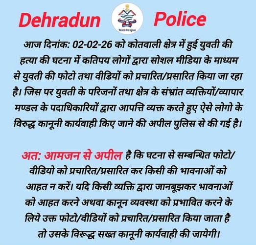देहरादून, 02 फरवरी। दून पुलिस अधिकारियों का कहना हैं की आज कोतवाली क्षेत्र में हुई युवती की हत्या की घटना में कतिपय लोगों द्वारा सोशल मीडिया के माध्यम से युवती की फोटो तथा वीडियों को प्रचारित/प्रसारित किया जा रहा है, जिस पर युवती के परिजनों तथा क्षेत्र के संभ्रांत व्यक्तियों, व्यापार मण्डल के पदाधिकारियों द्वारा आपत्ति व्यक्त करते हुए ऐसे लोगों के विरुद्ध कानूनी कार्रवाई किये जाने की अपील पुलिस से की गई है। अत: दून पुलिस ने आमजन से अपील है कि घटना से सम्बन्धित फोटो, वीडियो को प्रचारित, प्रसारित कर किसी की भावनाओं को आहत न करें, यदि किसी व्यक्ति द्वारा जानबूझकर भावनाओं को आहत करने अथवा कानून व्यवस्था को प्रभावित करने के लिये उक्त फोटो, वीडियों को प्रचारित, प्रसारित किया जाता है तो उसके विरूद्ध सख्त कानूनी कार्यवाही की जायेगी।
